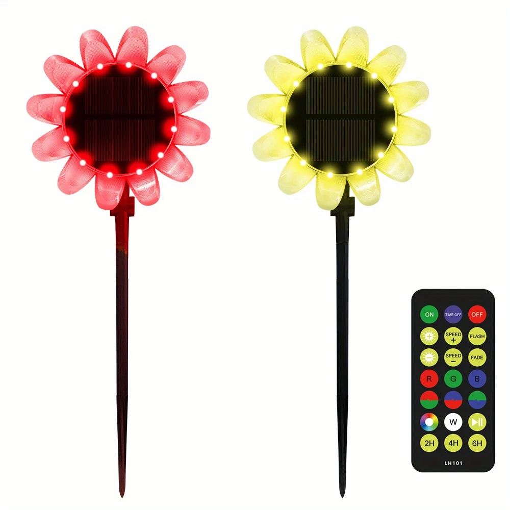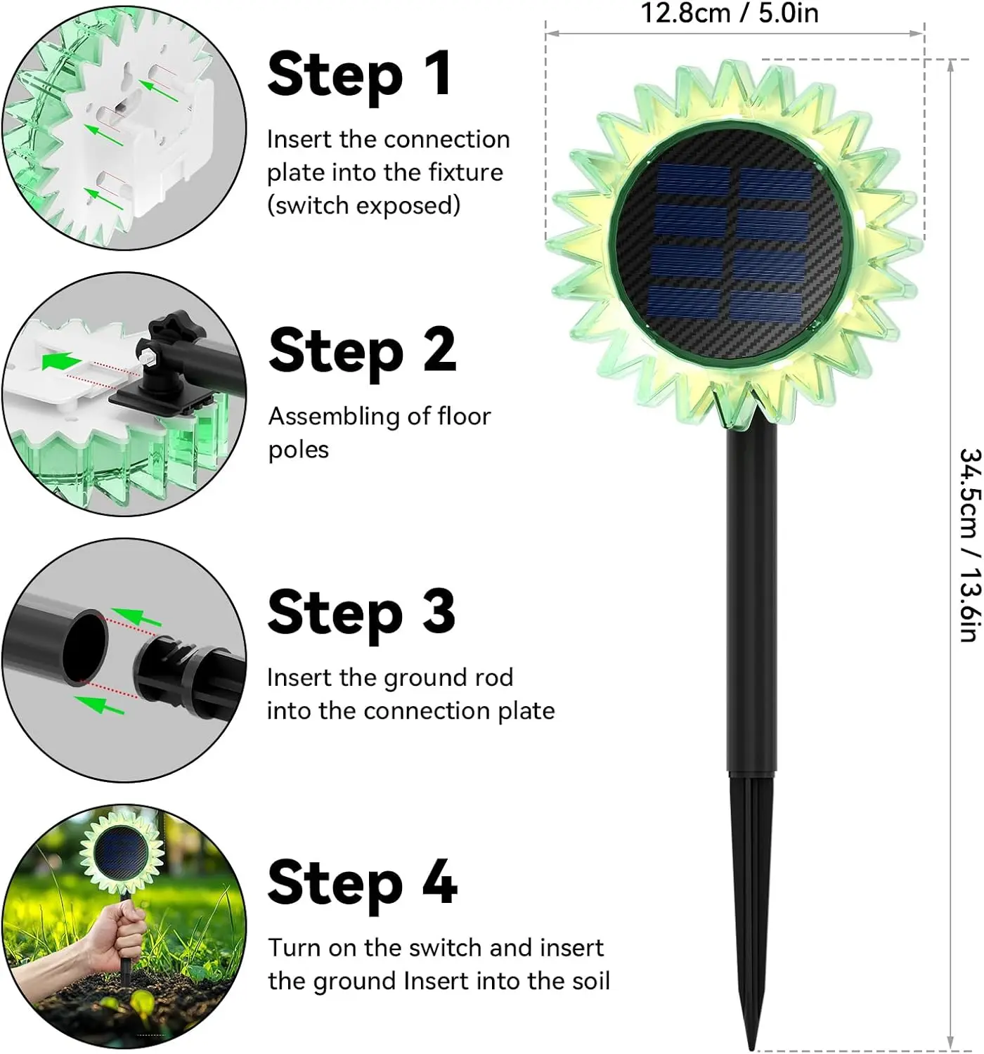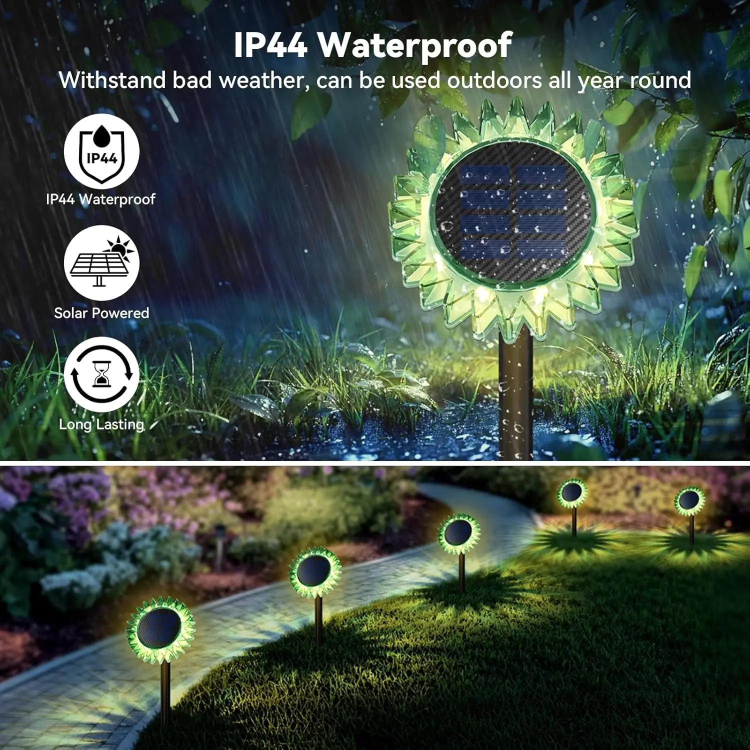 【Two ways to use and easy to install】Solar sun flower walkway lights are easy to install,available in both floor and wall mounted versions,Suitable for various scenarios,good waterproof function and temperature resistance at the same time,so you don't have to worry about bad weather affecting its work.